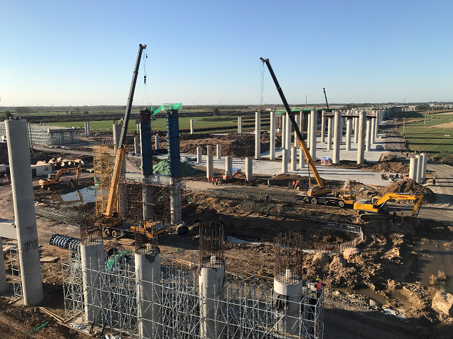 新機場高速公路項目(一期工程先期實施段)位于青島膠州市,是青島膠東國際機場整體項目的重要交通樞紐工程。我公司承建其6座匝道橋。計:鉆孔灌注樁355根、樁基系梁84根、墩柱84排、墩柱系梁52根、蓋梁24根、現(xiàn)澆箱梁24聯(lián)。全橋平均高度為19米,混凝土方量約8萬立方米。