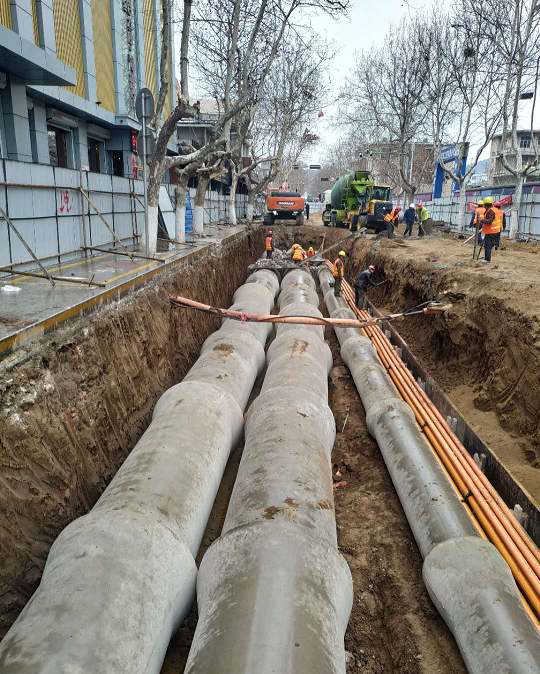目前氣象局連接路強弱電管線全部鋪設(shè)完成,累計拆除人行道1400㎡,開挖土方1500m3;九丈崖路完成污水管道380m,土路基已基本碾壓成型;樂園大街砼路面破碎完成外運13000㎡,通海路至長山路段電力包封施工完成,通海路至陵園路綜合管槽開挖220m、雨污水管及弱電管線敷設(shè)500米、弱電、強電管敷設(shè)完成,檢查井砌筑完成。
