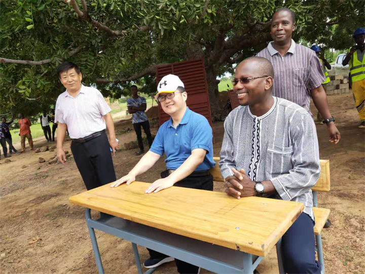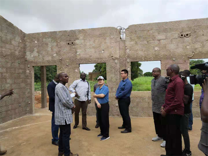 瓦羅部長及李健大使在集團分公司經(jīng)理王勃陽的陪同下,共同視察了ZINIARE小學施工現(xiàn)場,參觀了現(xiàn)場教室及廁所主體,桌椅、鋼結構及水井,對我集團的施工質量和進度給予高度的認可。