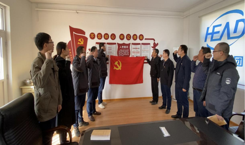 集團執(zhí)行總裁孫成山(左二)帶領(lǐng)二分黨員同志共同學(xué)習(xí)