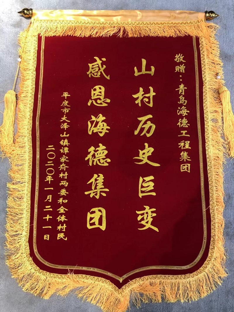 集團(tuán)董事長(zhǎng)鞏光磊對(duì)于孫夕臣書(shū)記一行的到來(lái)表示熱烈歡迎。孫書(shū)記表示此行的目的是為了代表平度市大澤山鎮(zhèn)譚家夼村兩委和全體村民對(duì)于海德集團(tuán)為譚家夼村修筑兩條扶貧路表示衷心感謝。會(huì)上,孫夕臣書(shū)記向我集團(tuán)贈(zèng)送“山村歷史巨變,感恩海德集團(tuán)”的錦旗,并祝愿海德集團(tuán)蒸蒸日上,越來(lái)越好。