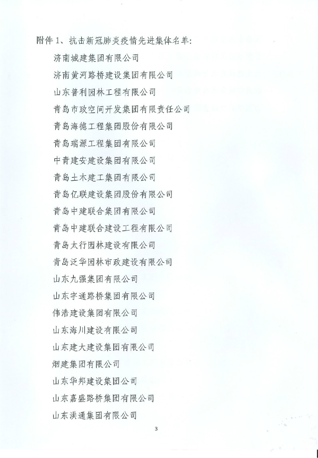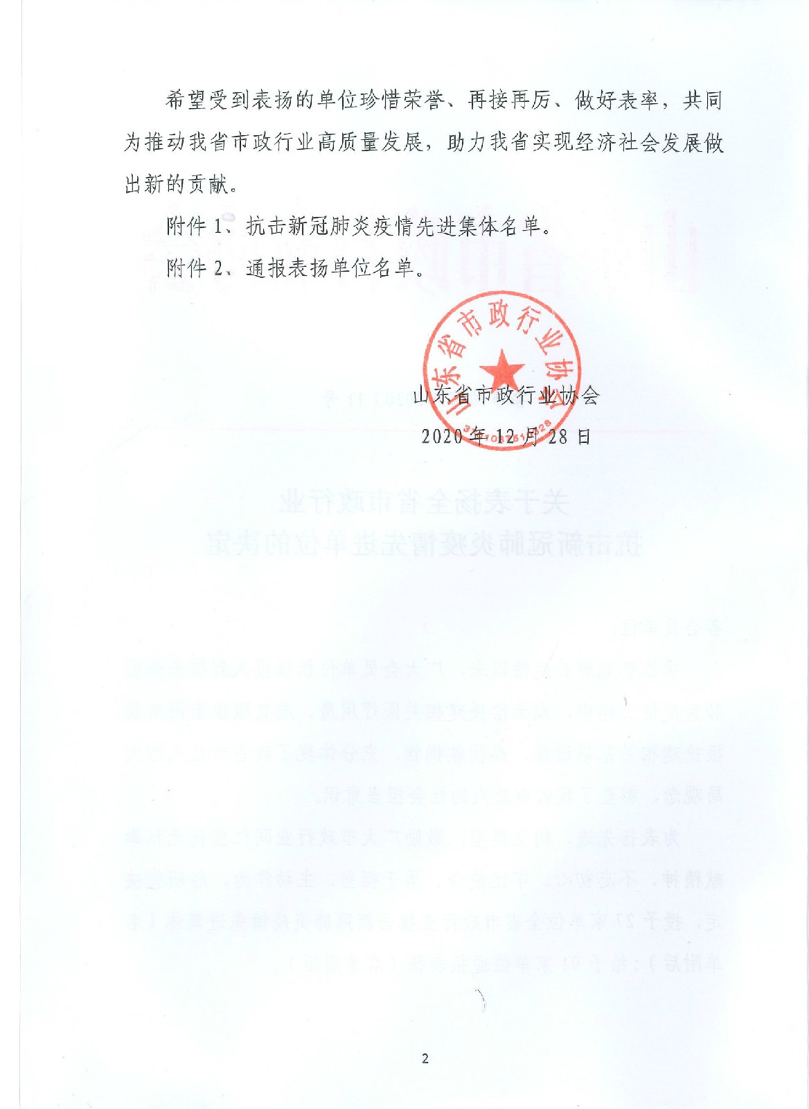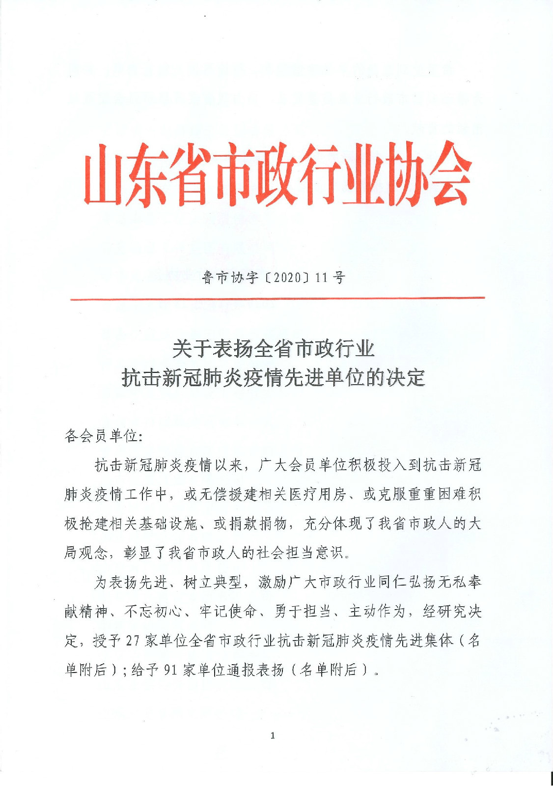 2020年12月28日,山東省市政行業(yè)協(xié)會印發(fā)《關(guān)于表揚全省市政行業(yè)抗擊新冠肺炎疫情先進單位的決定》,集團公司榮獲全省市政行業(yè)抗擊新冠肺炎疫情先進集體稱號。