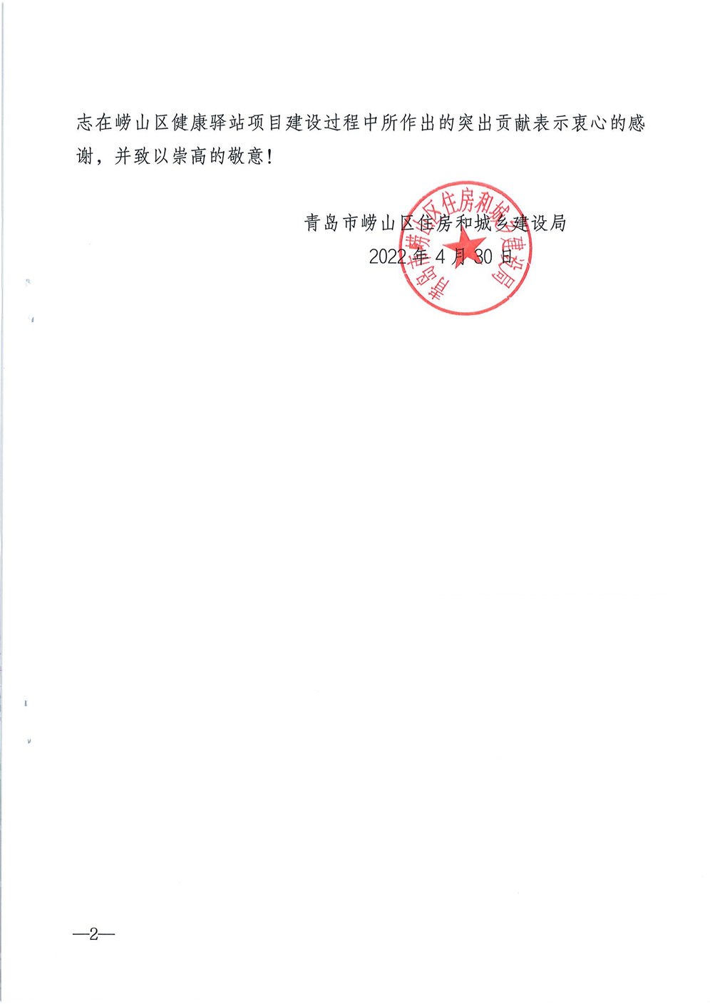 近日,嶗山區(qū)住房和城鄉(xiāng)建設(shè)局向我集團公司發(fā)來感謝信,對我集團公司派駐“嶗山區(qū)健康驛站”援建項目的集團總裁助理、代建事業(yè)部總經(jīng)理韓德克同志提出表揚,對集團公司及韓德克同志在建設(shè)過程中作出的突出貢獻(xiàn)表示衷心的感謝,并致以崇高的敬意!
