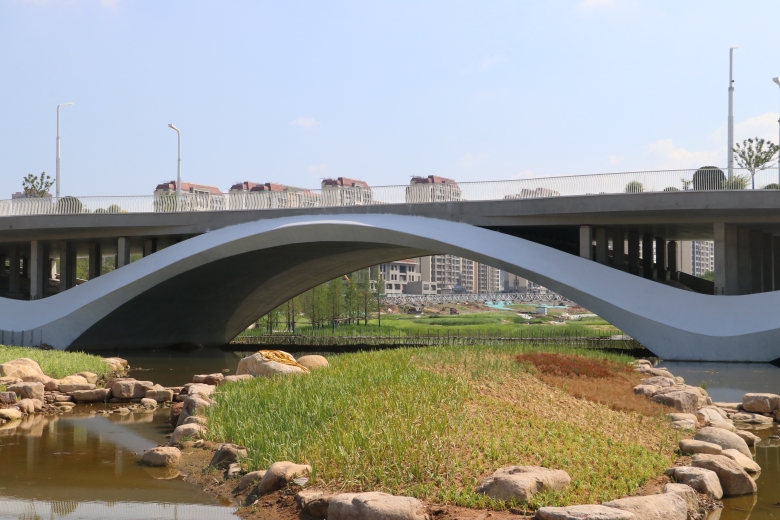 張村河瑤海路橋項目南起科技園一路,北至規(guī)劃十三號線,全長115米,主跨徑50米,是青島市跨徑最大的現(xiàn)澆混凝土箱型拱橋。其設(shè)計靈感源于“水波蕩起的漣漪”,中跨拱座上方巧妙設(shè)置4個觀景平臺,而拱圈側(cè)面為獨特的異形混凝土及鋁板漣漪造型。