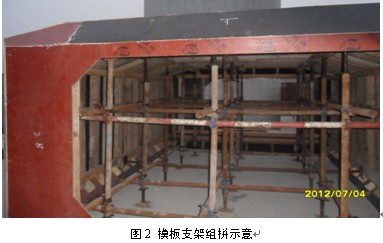 選擇地面平整且塔吊能輻射的范圍作為模板支架組裝場(chǎng)地。首選擺放支架底托調(diào)至設(shè)計(jì)高度,搭設(shè)立桿、縱橫向水平桿用直角扣件鎖緊,立桿安裝上托調(diào)至設(shè)計(jì)高度,縱橫向水平桿兩端每隔一跨安裝絲托作為加固模板支撐,待模板精確定位后搭設(shè)斜桿支撐上梗脅。