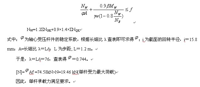 根據(jù)《建筑施工扣件式腳手架安全技術(shù)規(guī)范》有關(guān)模板支架立桿的穩(wěn)定性計(jì)算公式[2]: