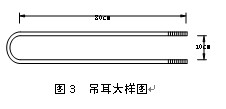 吊耳設(shè)在內(nèi)箱縱向1/4、橫向1/4處,共4個(gè)吊點(diǎn),保證重心平衡,吊耳用φ16圓鋼制作,下端鎖扣在內(nèi)模支架水平桿上,每個(gè)吊耳鎖扣1根6 m吊帶。吊耳如圖3所示。