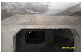 拆除時(shí)應(yīng)按順序由上而下、一步一清,不準(zhǔn)上下同時(shí)作業(yè)。拆除腳手架斜桿,應(yīng)先拆中間扣,再拆兩頭扣,由中間操作人往下桿子;拆除模板支架?chē)?yán)禁猛撬、硬砸或大面積撬落和拉倒。完工前,不得留下松動(dòng)和懸掛的模板,拆下的模板應(yīng)及時(shí)運(yùn)送到指定地點(diǎn)集中堆放。采用內(nèi)箱模板整體安裝,混凝土一次性澆筑后的箱內(nèi)情況如圖5所示。