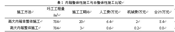 2) 內(nèi)箱整體性施工,由于可以提前制作整體模板,故可節(jié)約大量的時(shí)間和資金,具有較好的經(jīng)濟(jì)效益(見(jiàn)表1)。