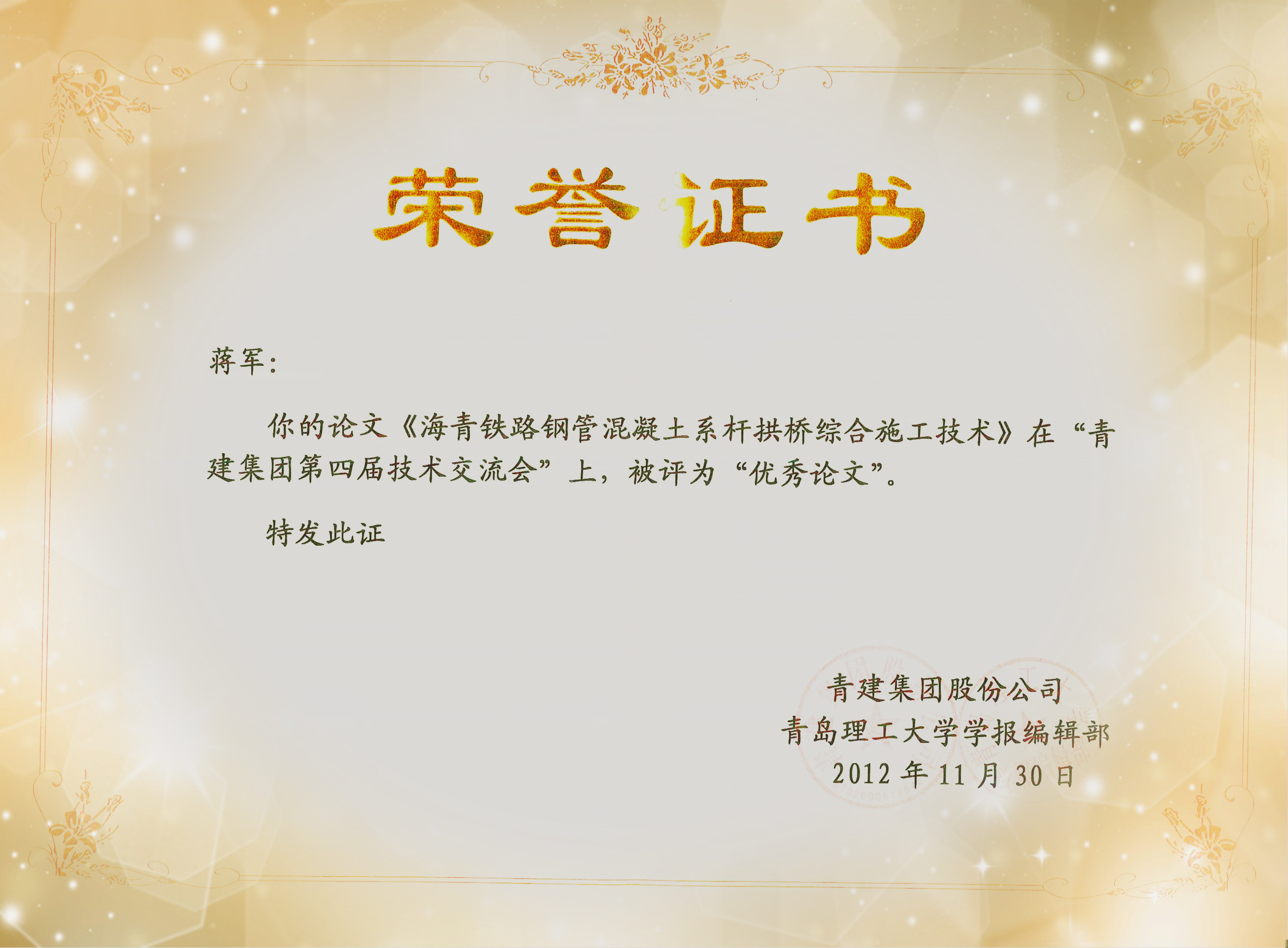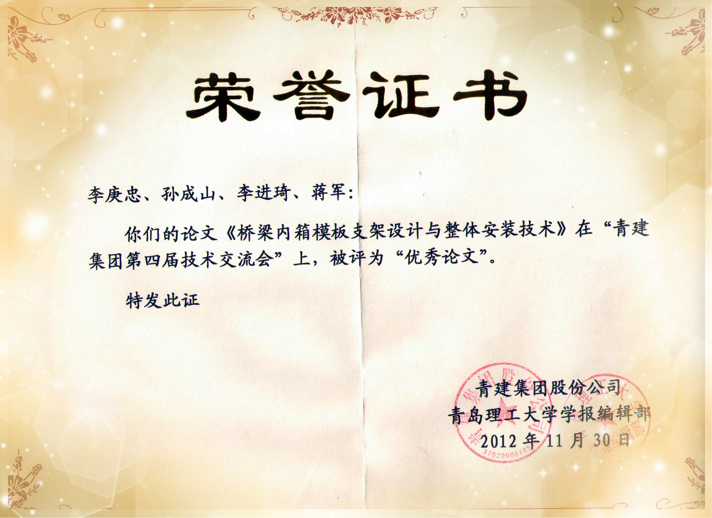 本次交流會議是繼青建集團(tuán)首屆(2006)、第二屆(2008)、第三屆(2010)技術(shù)交流會成功舉辦之后的又一次技術(shù)盛會,以“交流、創(chuàng)新、合作、共贏”為宗旨,在校企雙方共同交流的基礎(chǔ)上,聘請國內(nèi)知名專家進(jìn)行專題講座,為廣大科技人員奉獻(xiàn)了一場知識盛宴。本次參會的論文主要是結(jié)合近年來集團(tuán)各公司及成員單位項(xiàng)目施工過程中的重點(diǎn)、難點(diǎn)技術(shù)總結(jié)完成。共收集論文77篇,評選出優(yōu)秀論文26篇。我公司共提交論文7篇,其中《海青鐵路鋼管混凝土系桿拱橋綜合施工技術(shù)》(作者:蔣軍)、《橋梁內(nèi)箱模板支架設(shè)計(jì)與整體安裝技術(shù)》(作者:李庚忠)獲得優(yōu)秀論文,蔣軍代表公司在會上作了交流匯報,優(yōu)秀論文作者獲得了集團(tuán)股份公司與青島理工大學(xué)??庉嫴柯?lián)合頒發(fā)的榮譽(yù)證書,含優(yōu)秀論文在內(nèi)的5篇論文將在《青島理工大學(xué)學(xué)報》上公開發(fā)表。