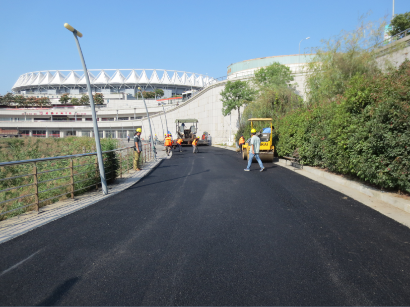環(huán)湖路位于國信體育場游泳跳水館旁,道路全長625米,為體育場內(nèi)部主要道路之一。現(xiàn)狀道路面層為3cm厚彩色強(qiáng)固混凝土,起砂、破損嚴(yán)重,嚴(yán)重影響行車舒適性。本工程為舊路綜合整治工程,設(shè)計(jì)將車行道舊彩色透水混凝土面層進(jìn)行銑刨,并鋪設(shè)3cm厚AC-10瀝青混凝土
