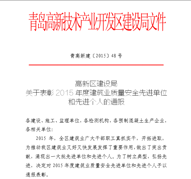 2015年12月,青島高新技術產(chǎn)業(yè)開發(fā)區(qū)建設局下發(fā)《青高新建【2015】48號》文件,表彰2015年度紅島經(jīng)濟區(qū)(高新區(qū))建筑業(yè)質量安全先進單位和先進個人。公司作為參與高新區(qū)市政工程建設的施工單位,榮獲“質量安全先進單位”的殊榮,一分公司程顯光和鄒曉杰分別獲得“質量管理先進個人”和“安全管理先進個人”的光榮稱號。