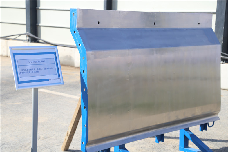 活動(dòng)最后,市住建局領(lǐng)導(dǎo)一行又觀摩了項(xiàng)目上使用的新型材料。為了響應(yīng)國家“綠水青山”發(fā)展理念,盡可能減少天然石材的使用,集團(tuán)全資子公司青島海德信達(dá)新型材料科技有限公司采用日本技術(shù)、德國工藝研發(fā)了仿石路緣石及仿石透水板等新型材料應(yīng)用到此項(xiàng)目中,具有施工速度快、仿石效果好、強(qiáng)度高、耐磨性能好、抗凍融性佳、透水效果高等優(yōu)點(diǎn),是對(duì)海綿城市理念的全面落實(shí)。用于橋梁墩柱施工的“5+1”不銹鋼復(fù)合板模板,作為一種資源節(jié)約型的產(chǎn)品可以減少貴重金屬的消耗,又兼具各種碳素鋼和不銹鋼的特點(diǎn),可以進(jìn)行熱壓、冷彎、切割、焊接等各種加工,有良好的工藝性能,相較于普通模板有表面平整度高、易清潔、易脫模的優(yōu)點(diǎn),能夠有效提高混凝土的外觀質(zhì)量。