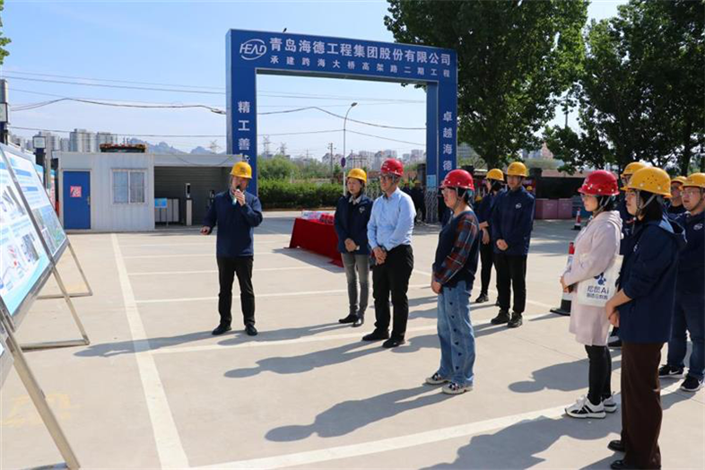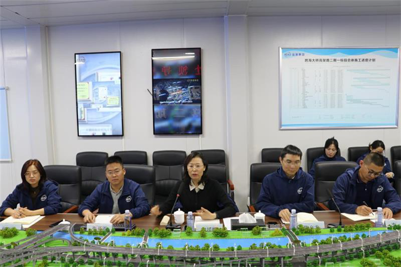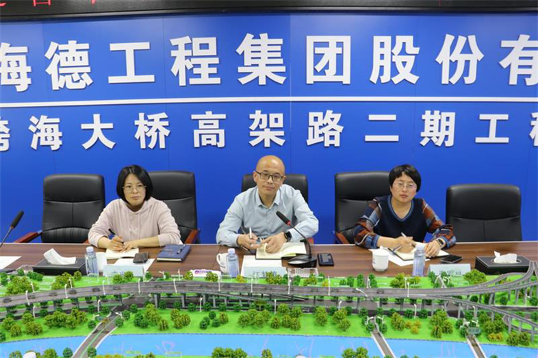 副處長江夢策一行首先聽取了跨海大橋高架路二期項目總體概況和工程亮點的匯報,并參觀了項目現(xiàn)場;隨后與集團(tuán)商務(wù)人員進(jìn)行了座談和交流。集團(tuán)公司執(zhí)行總裁寇媛媛對江夢策一行的到來表示熱烈歡迎,介紹了集團(tuán)公司全產(chǎn)業(yè)鏈業(yè)務(wù)布局及生產(chǎn)經(jīng)營情況,重點匯報了企業(yè)工程造價管理過程中遇到的問題和存在的困難。