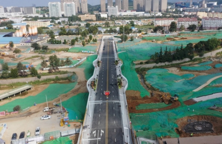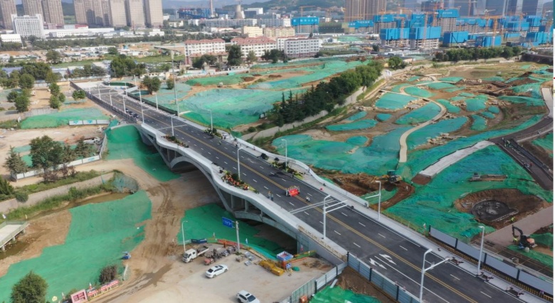張村河改造片區(qū)共規(guī)劃建設(shè)五座跨河橋梁,其中科技園五路橋項(xiàng)目南起瑤海路,北至科苑緯一路,橋梁命名為“漣漪”,以水波蕩起漣漪為設(shè)計(jì)元素。橋梁采用三跨連續(xù)拱橋結(jié)構(gòu),全長(zhǎng)115米,寬21-27米,主跨跨徑50米,是目前山東省城市內(nèi)主跨跨徑最大的現(xiàn)澆混凝土箱型跨河拱橋。首橋通車新聞被“嶗山融媒”和“觀海”等新聞媒體進(jìn)行宣傳報(bào)道。