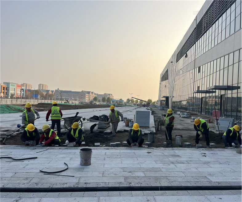 宿豫電商園區(qū)附屬配套工程施工內(nèi)容涵蓋道路、管網(wǎng)、鋪裝、塑膠場地、綠化、水景、小品、景觀照明等方面。自7月初進場,項目部全體人員齊心協(xié)力推進項目有序開展,并在勞務(wù)管理方面設(shè)置專員,確保工人工資發(fā)放到位。場地空間的局限、雨季的干擾以及交叉施工的復雜性,都未能阻擋工程的進度。經(jīng)過不懈努力,10月底項目所有地下管網(wǎng)施工全部完工,11月場地整平、廣場鋪裝等工作大面積展開。
