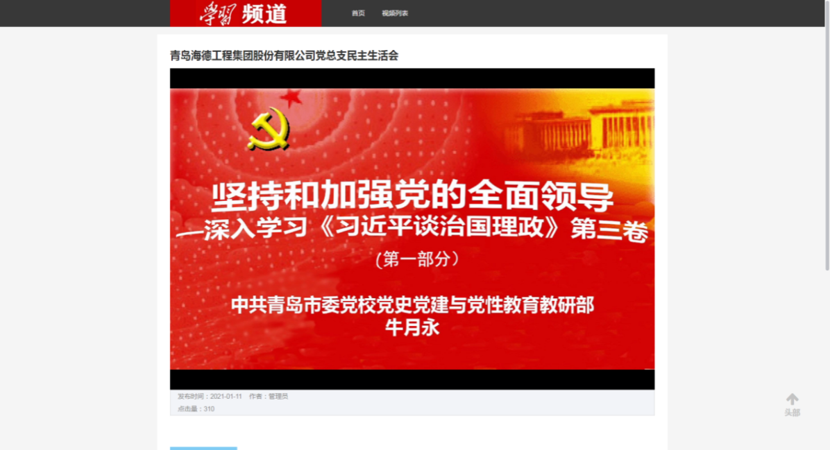 2021年1月12日,集團(tuán)公司組織全體黨員開(kāi)展學(xué)習(xí)《習(xí)近平談治國(guó)理政》(第三卷)和民主生活會(huì)活動(dòng),通過(guò)“學(xué)習(xí)強(qiáng)國(guó)”的“學(xué)習(xí)頻道”網(wǎng)絡(luò)直播形式,收聽(tīng)了中共青島市委黨校牛月永教授的《堅(jiān)持和加強(qiáng)黨的全面領(lǐng)導(dǎo)》網(wǎng)絡(luò)黨課。